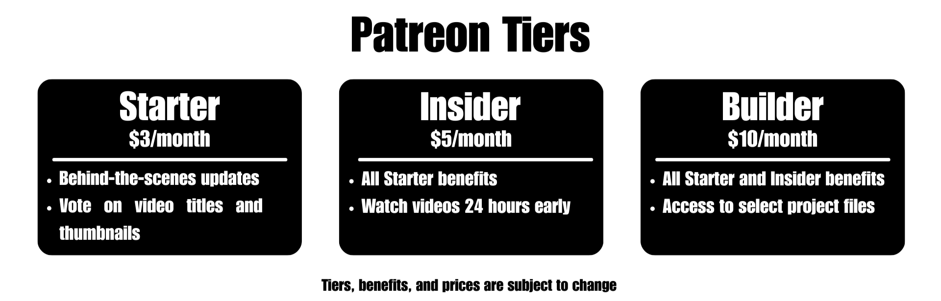 If you are interested in supporting my channel while also receiving exclusive benefits in return, then you can visit my Patreon page. I currently offer 3 tiers of monthly membership, ranging from $3 to $10. I also have a Patreon shop with project files from my videos. Patreon support goes a long way in allowing me to make bigger and better projects.